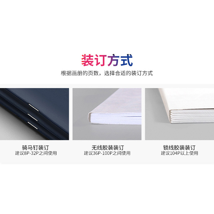 裝訂方式:起碼釘、無線膠裝、鎖線膠裝
